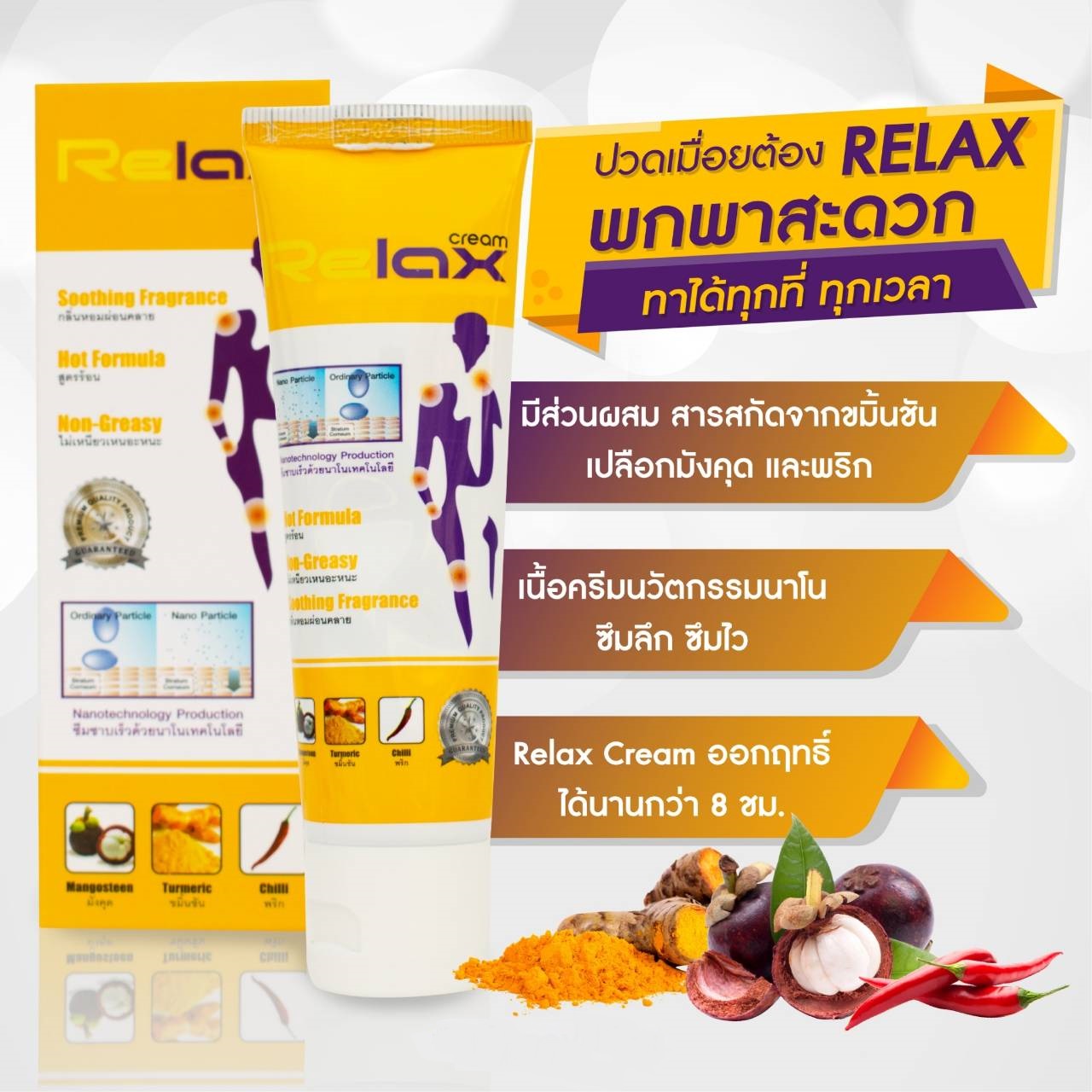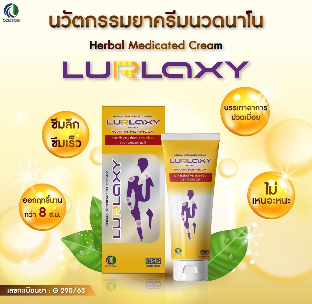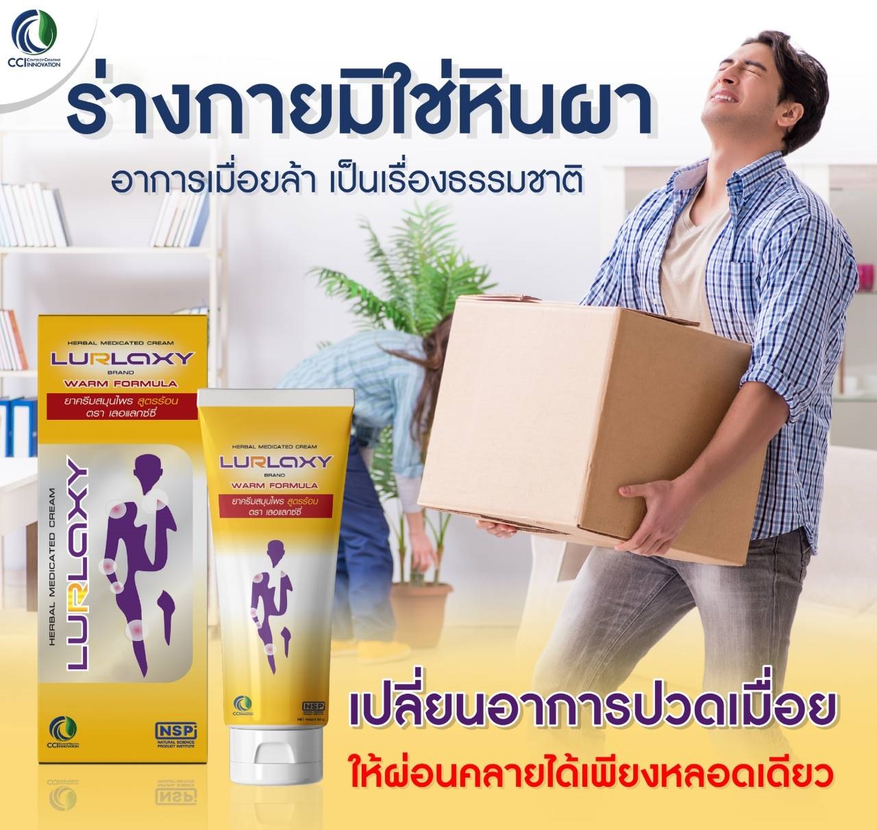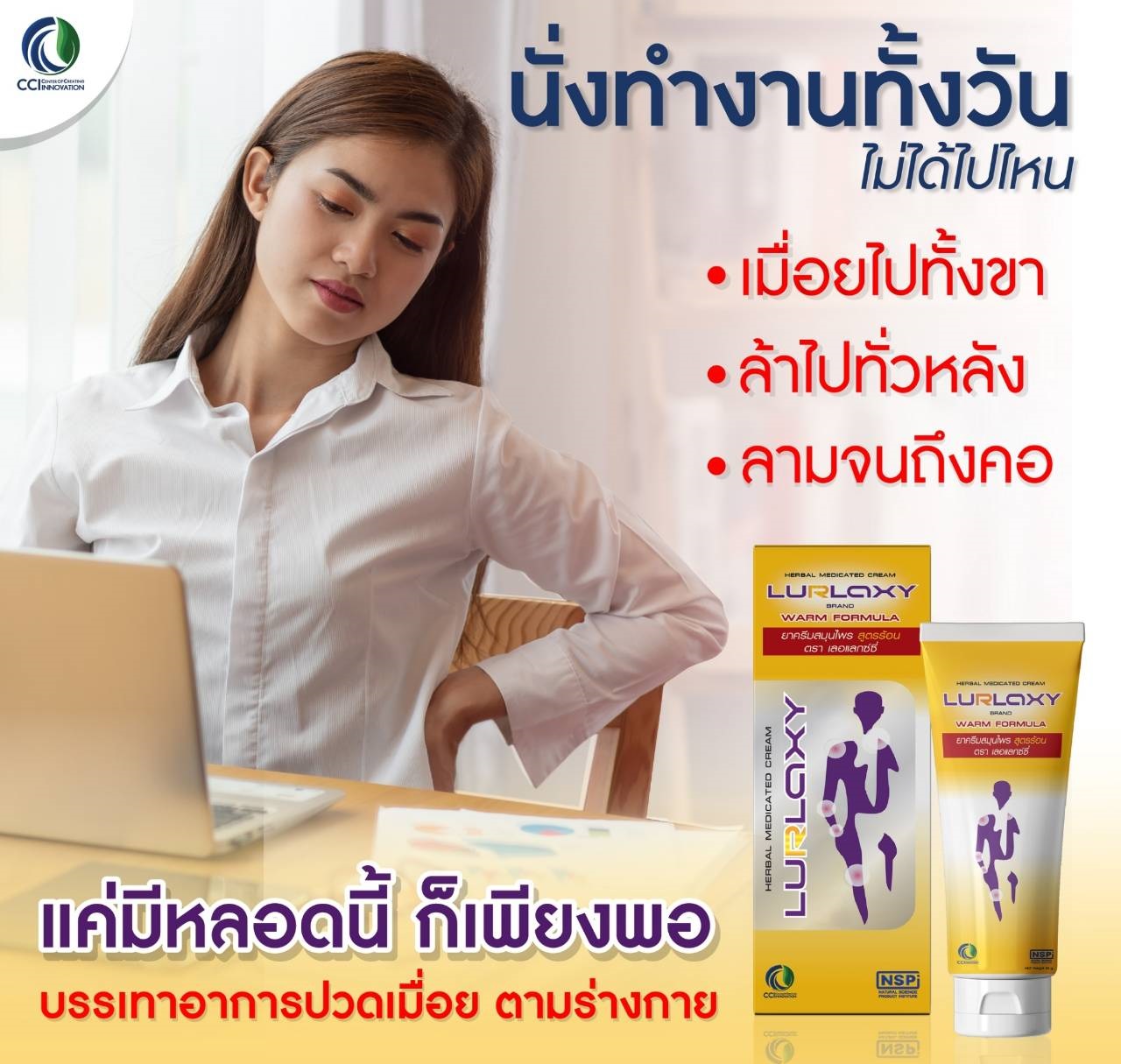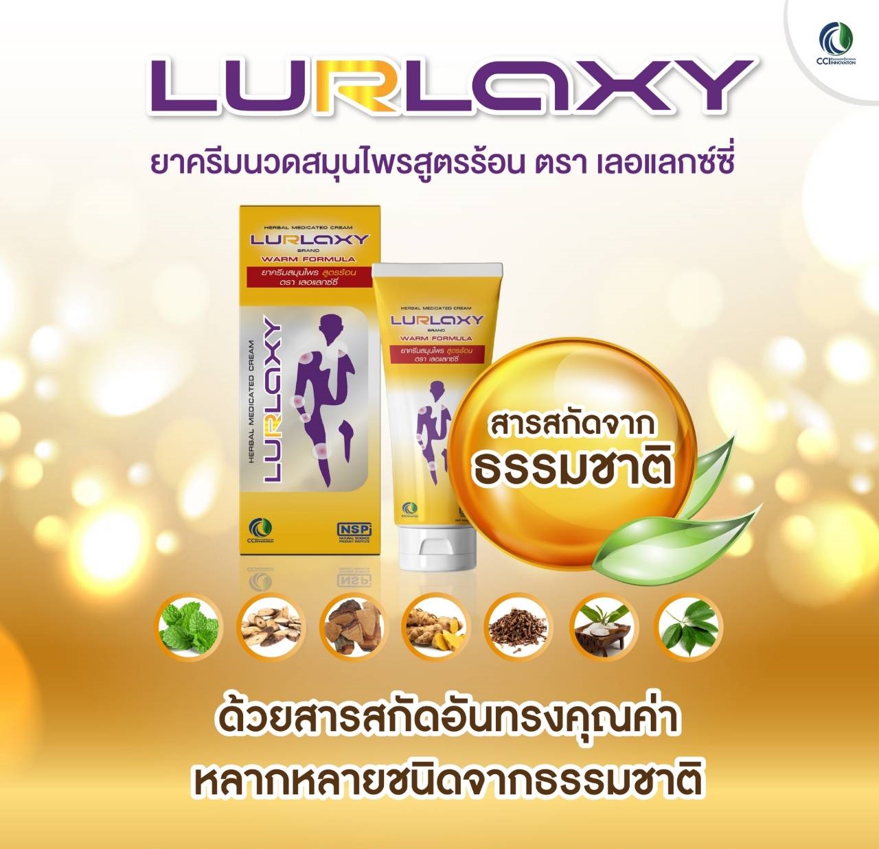 ผลิตภัณฑ์ครีมนวดนวัตกรรมใหม่ เปลี่ยนแบรนด์ใหม่จาก Relax Cream เป็น Lurlaxy Cream เนื่องจากได้ขึ้นทะเบียนยาสามัญประจำบ้านเรียบร้อยแล้ว ผลิตด้วยนาโนเทคโนโลยี ซึมลึก ซึมเร็ว ออกฤทธิ์นาน โดยทีมวิจัยได้คัดสรรสมุนไพรไทยหลากหลายชนิด ซึ่งมีผลในการรักษา บรรเทาการปวดข้อ เส้นเอ็น และกล้ามเนื้อ รวมถึงอาการแมลงสัตว์กัดต่อย โดยนำมาผ่านขั้นตอนการสกัดอย่างเข้มข้น เพื่อให้ได้สาระสำคัญที่ออกฤทธิ์ต้านการอักเสบ