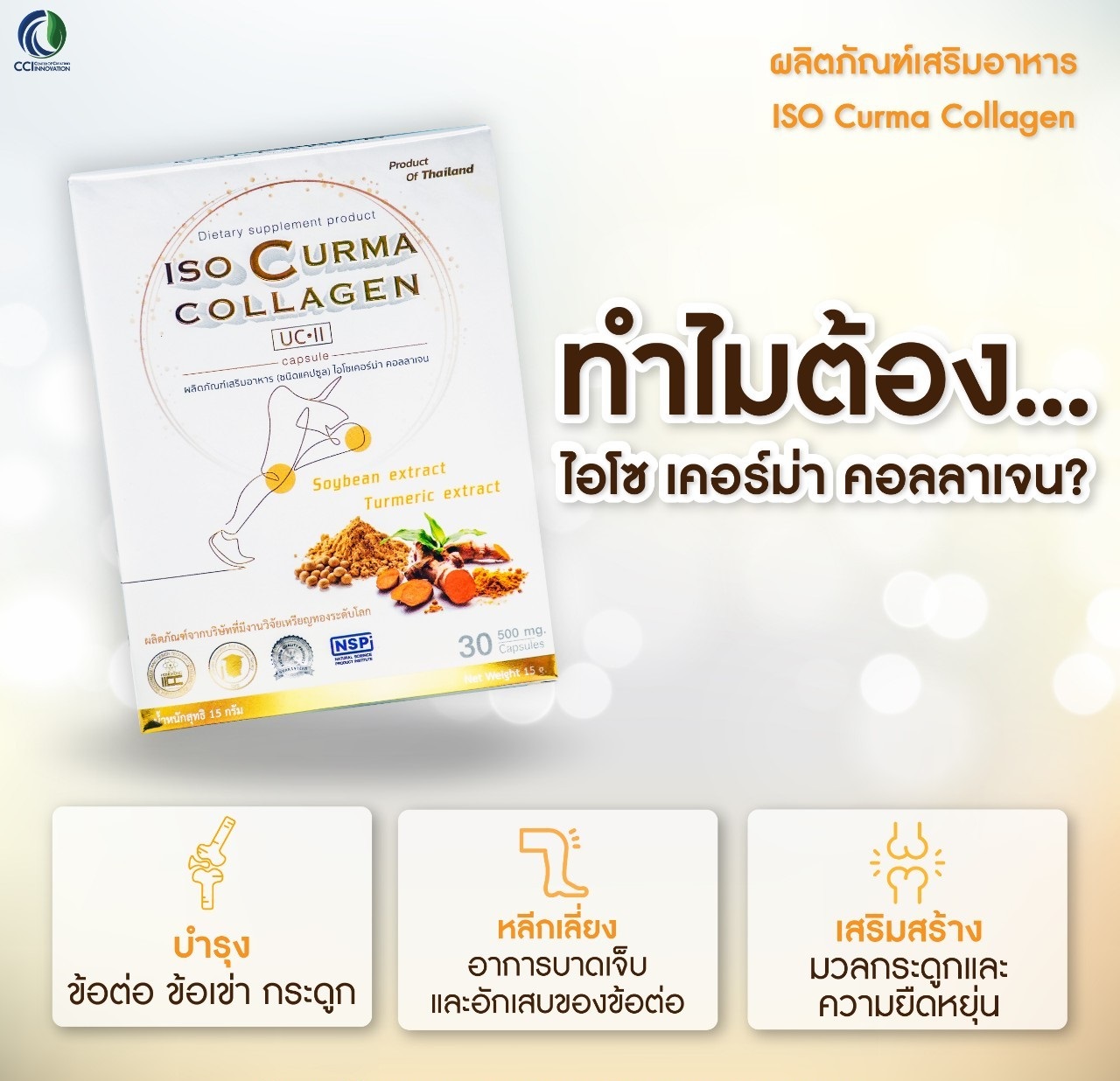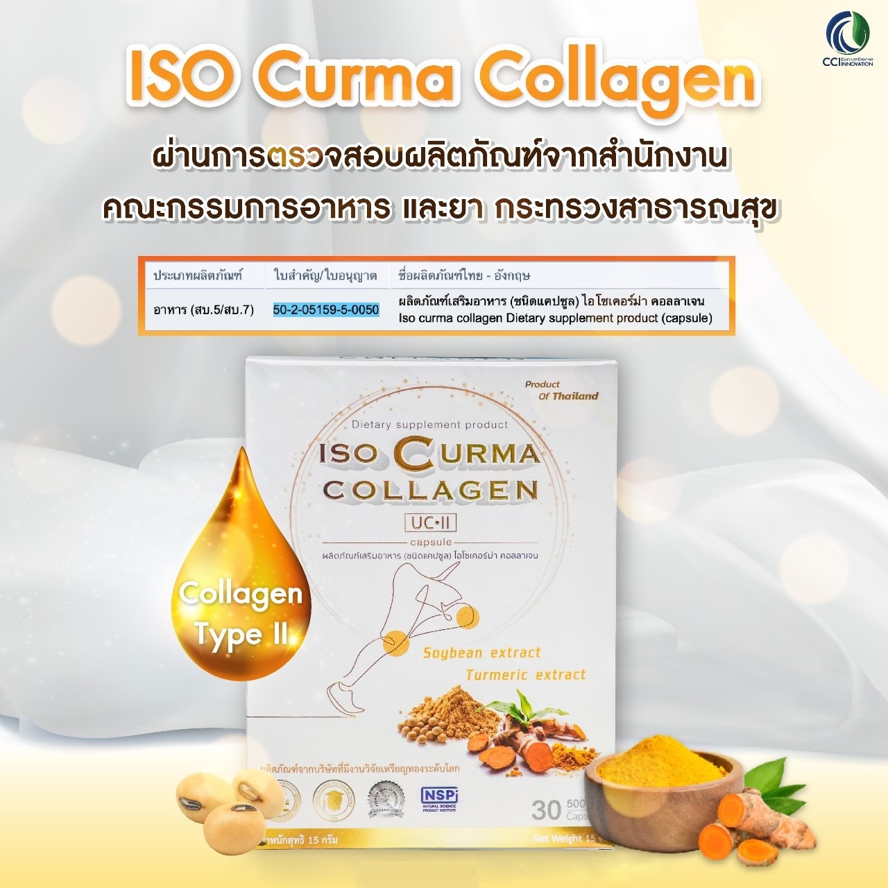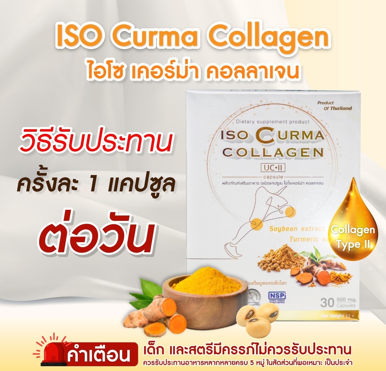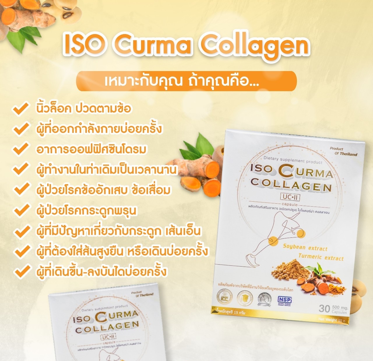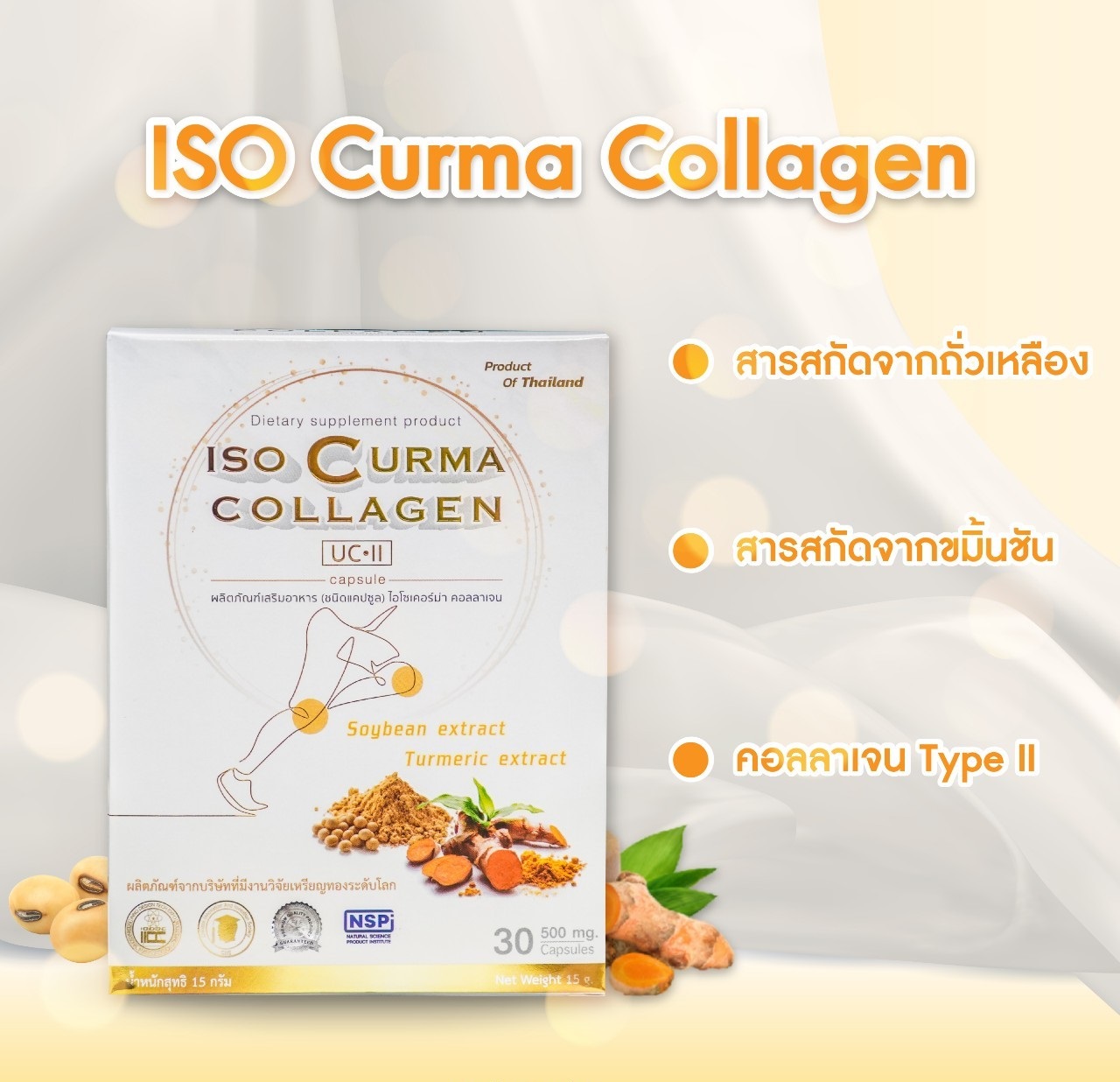 ISO Curma Collagen ผลิตภัณฑ์เสริมอาหารที่มีสารสกัด Curcuminoids จากขมิ้นชัน Collagen Type II และสารสกัด isoflavone จากถั่วเหลือง
